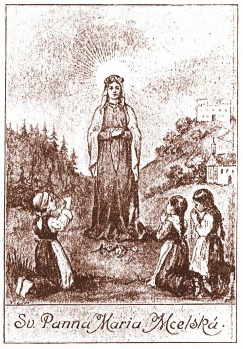 V roce 1849 v malé obci Mcely, čítající sotva šest stovek obyvatel, se více než třicetkrát zjevila Panna Marie s Ježíškem a andělem. Svým vnitřním zrakem nebešťany pozorovaly Františka Fryčová (11), Kateřina Halešová (9) a později se k nim přidala i Františka Plachá (12). Všechno začalo dopoledne 4. července, kdy první dvě dívky hlídaly mladší sourozence a hrály si s nimi v horní části návsi nazývané Stadniště.